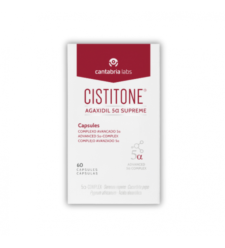 Cistitone Agaxidil 5Alf Supreme Cápsulas é um suplemento alimentar indicado para queda de cabelo crónica, formulado com complexo avançado 5α (Serenoa repens, óleo de semente de Cucurbita pepo, Pygeum africanum e ácido olenólico).