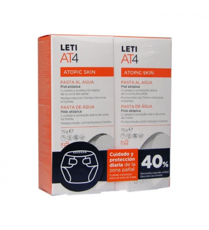 O Pack Leti AT4 Pasta de Água contém 2 unidades, com 40% de desconto na 2ª unidade. Creme dermo-reparador diário para pele delicada ou atópica do bebé, que protege e acalma a epiderme glútea, prevenindo irritações e ressecamento.