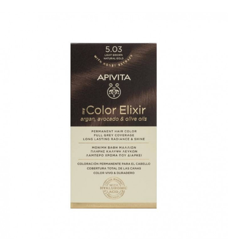 Apivita My Color Elixir Cor 5.03 Castanho Claro Dourado é uma coloração capilar permanente, especialmente formulada para obter resultados de coloração profissional de forma natural e segura, respeitando o equilíbrio natural do couro cabeludo.