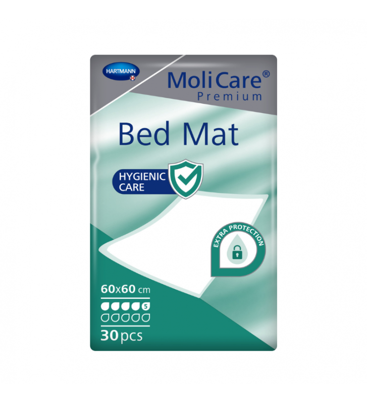 Os Resguardos Molicare Bed Mat com parte absorvente interna composta com polpa de celulose, proporcionam higiene e proteção extra com um nível de absorção de 5 Gotas, em casos de incontinência ou como proteção adicional da cama.