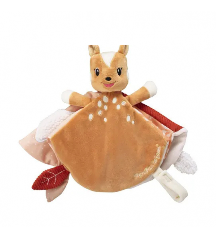 Além disso, o doudou conta com um sistema de fixação para a chupeta com Velcro, mantendo a chupeta sempre à mão e facilitando o cuidado com o bebé.