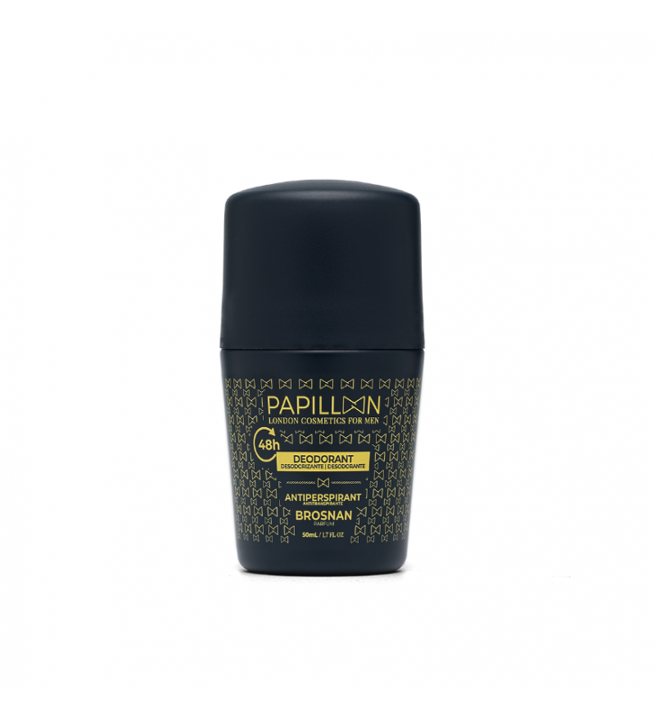 Papillon Brosnan Desodorizante Homem Roll-On oferece 48h de proteção. Perfumado com fragrância Brosnan, antiodor, transparente e antimanchas. Adequado para todos os tipos de pele.