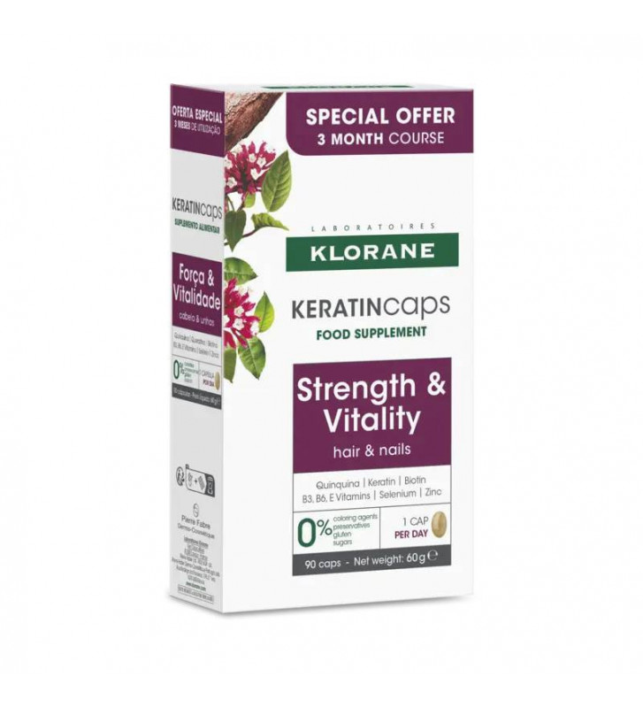 KeratinCaps da Klorane é um suplemento alimentar formulado para revitalizar o cabelo desde o interior, fortalecendo a fibra capilar, promovendo o crescimento saudável e ajudando a reduzir a queda.