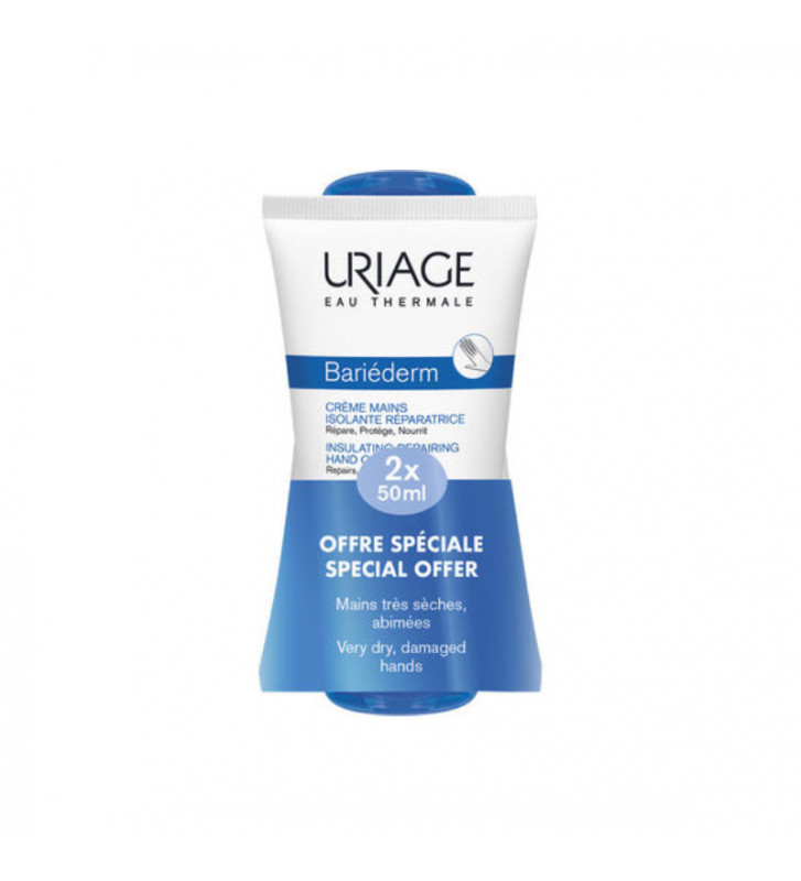 Uriage Bariéderm Creme de Mãos Duo é um pack composto por duas embalagens de 50ml. Uriage Bariéderm Creme de Mãos é um cuidado isolante e reparador para mãos muito secas, expostas a agressões quotidianas e produtos químicos. A fórmula contém associação de 2 Polimeros, confere-lhe uma ação isolante à superfície e previne futuras agressões à pele; Mel de Manuka, limita o risco de proliferação bacteriana; Água Termal de Uriage, apazigua a epiderme irritada. Não oleoso, absorvido rapidamente, invisível e resistente à água.