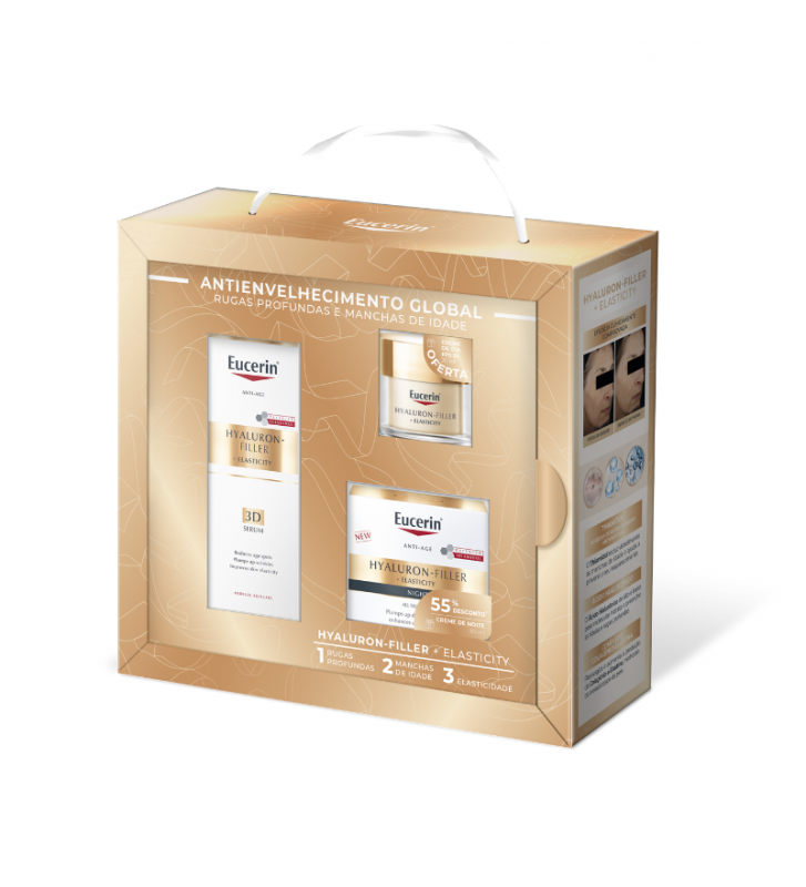 Surpreende este Natal com o coffret mais completo de Eucerin Hyaluron-Filler Elasticity. Um tratamento antienvelhecimento 3D que combina a ação intensiva de um sérum inovador com a regeneração noturna de um creme ricamente texturizado, e ainda a oferta de um creme de dia com proteção solar FPS 30. Tudo o que a sua pele precisa para um aspeto visivelmente rejuvenescido.
