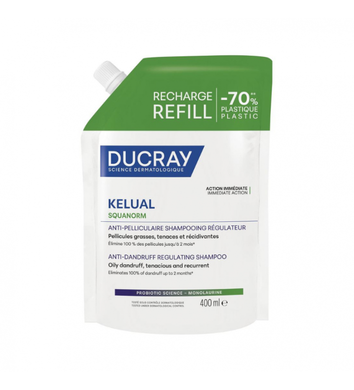 O Ducray Kelual Squanorm Champô Caspa Oleosa em formato recarga de 400ml é a solução perfeita para quem já conhece e confia na eficácia deste champô, mas quer fazer uma escolha mais consciente para o ambiente. Levas o mesmo produto, a mesma fórmula de alta performance, numa embalagem de recarga que reduz significativamente o consumo de plástico.